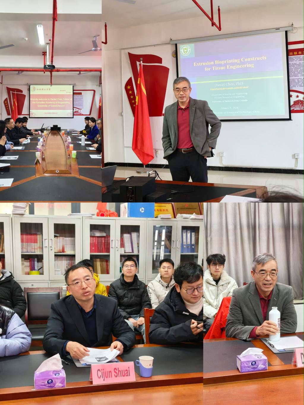 2026年1月6日,加拿大工程院院士、萨斯喀彻温大学Daniel Chen教授受邀到访我校植入医疗器械增材制造江西省重点实验室交流。能源与机械工程学院院长、国际创新研究院常务副院长帅词俊教授热情接待,双方围绕生物增材制造领域前沿进展与合作前景展开研讨。